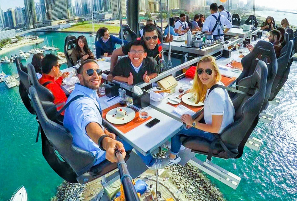 Located in Sky Dive Dubai, a table is suspended by a crane 50 meters high in the sky of Dubai, while you indulge in unique scenery and luxurious dining